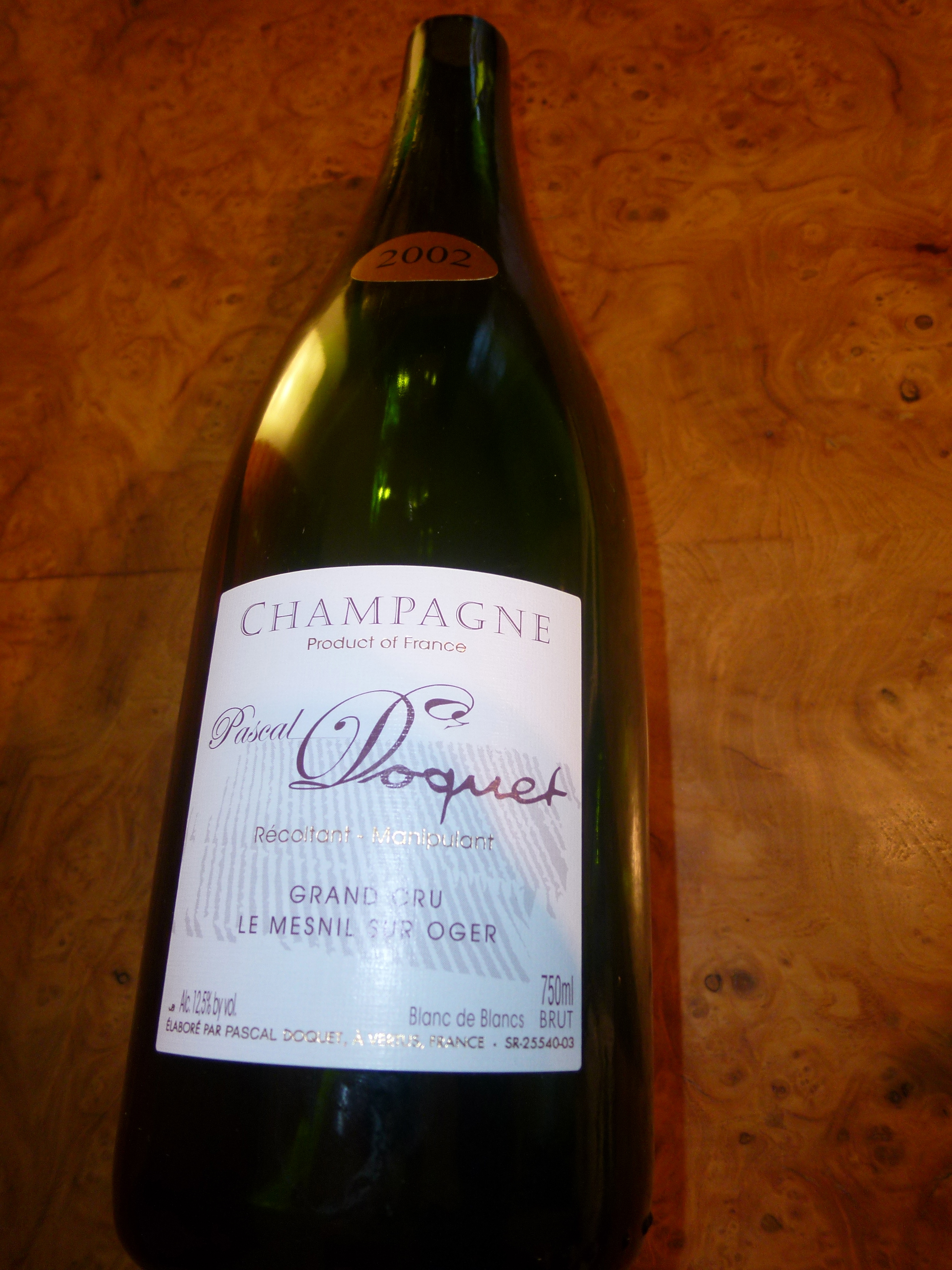 Issu de 100% de Chardonnay, le champagne Pascal Doquet grand cru 2002 blanc de blanc provient d’un millésime jugé exceptionnel pour la qualité de ses chardonnays. Il a mûri dans les caves du producteur à Vertus depuis avril 2003 et fut dégorgé le 9 mai 2012 .
