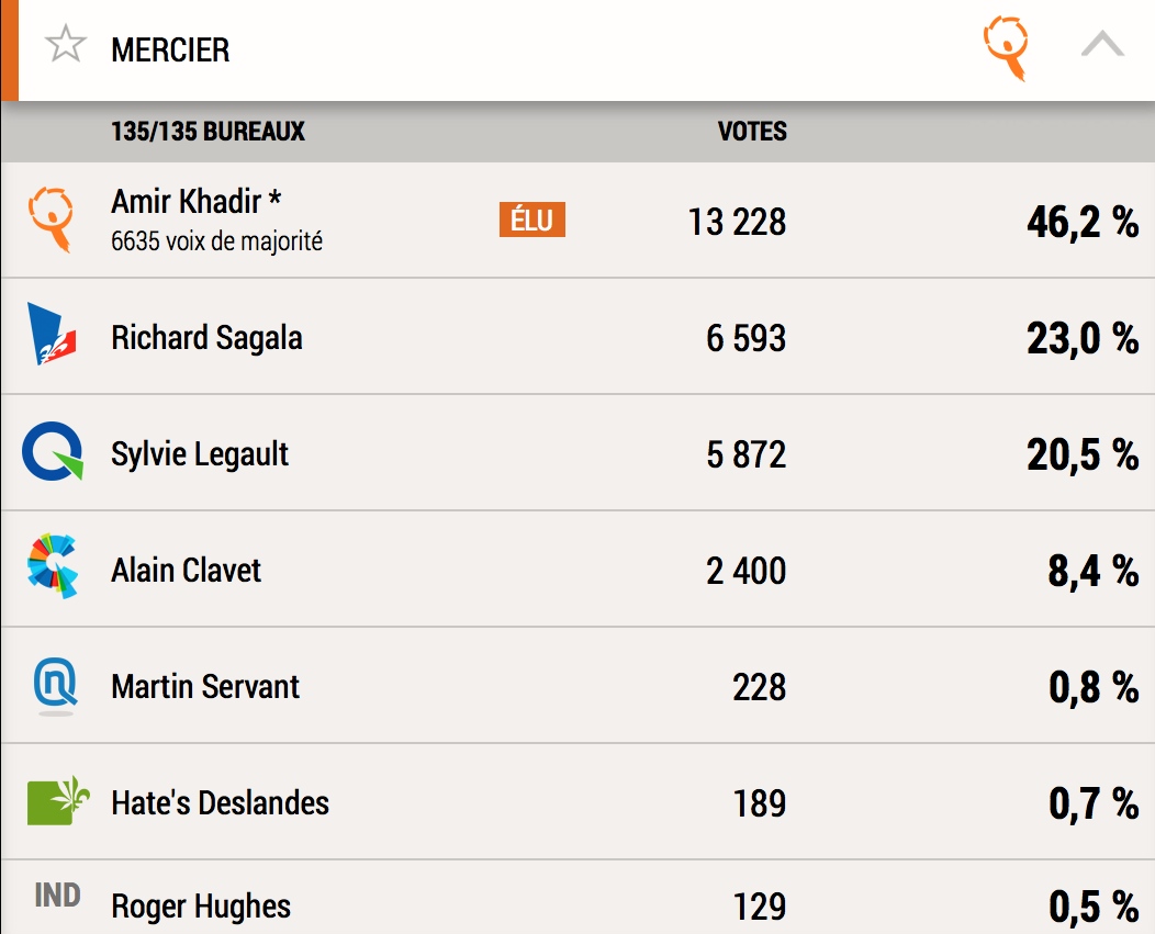 Pour le Parti Libéral du Québec, prendre la deuxième place avec 23% des voix (soit 62% de + de voix qu’en 2012) reléguant le Parti Québécois à la troisième place constitue une première dans Mercier, du jamais vu en 38 ans.