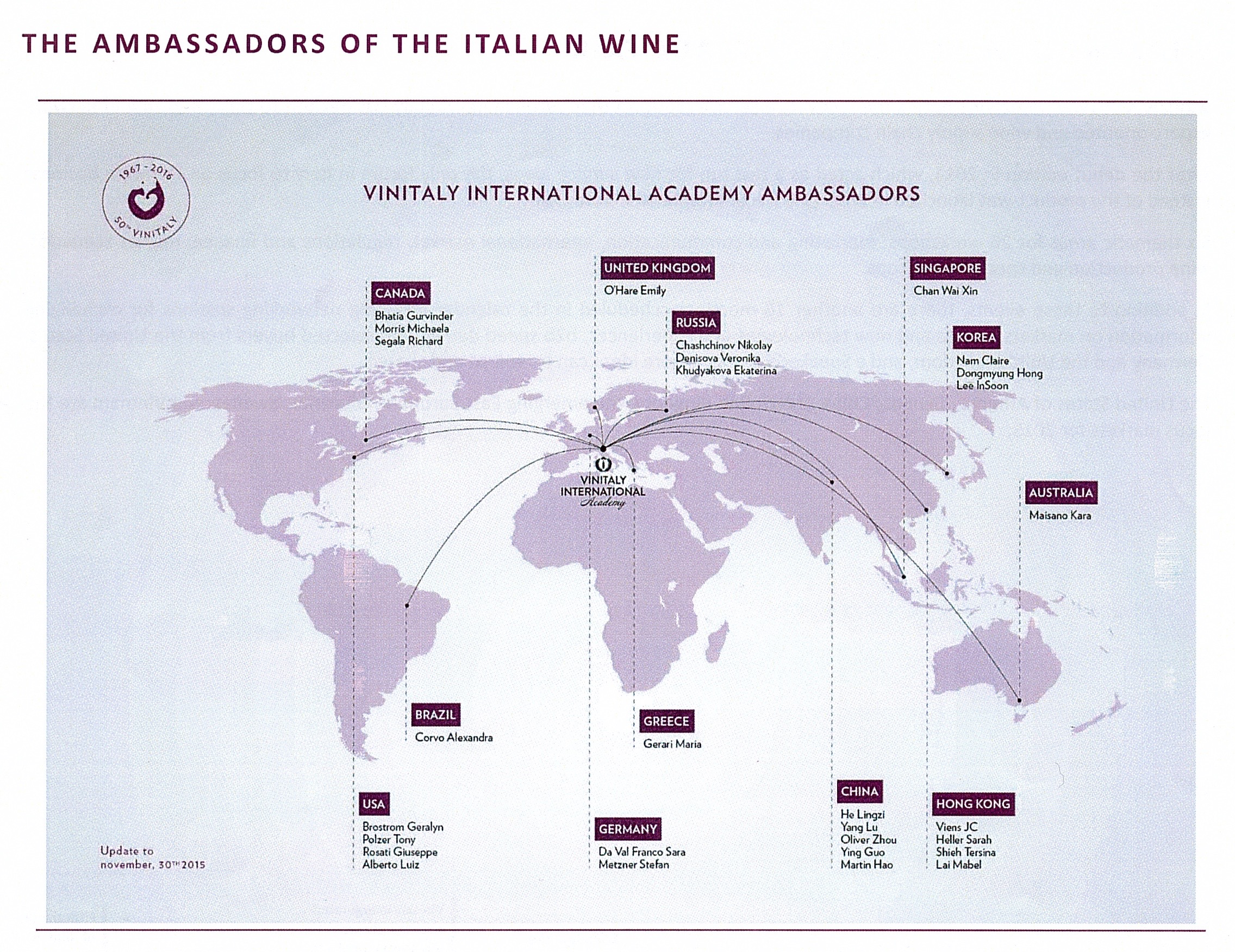 World location of Italian Wine Ambassadors par Richard SagalaPublié le 16 décembre 2015 Vinitaly International Academy unveils the identities of its first 26 Italian Wine Ambassadors Partager :Partager Cliquez pour partager sur Facebook(ouvre dans une nouvelle fenêtre) Facebook Cliquer pour partager sur X(ouvre dans une nouvelle fenêtre) X Cliquez pour partager sur LinkedIn(ouvre dans une nouvelle fenêtre) LinkedIn Cliquez pour partager sur Pinterest(ouvre dans une nouvelle fenêtre) Pinterest Cliquer pour envoyer un lien par e-mail à un ami(ouvre dans une nouvelle fenêtre) E-mail J’aime chargement…